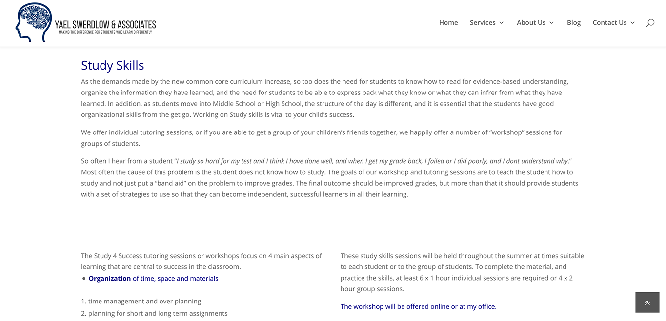 Yael Swerdlow & Associates is a tutoring center for kids in Marietta, GA. Yael was referred by my other client. When she first came to us, she was frustrated about her website. She had all the contents ready, but she was not satisfied how she organized the content and the way it looked. She told me: "that's not the website I want to publish."